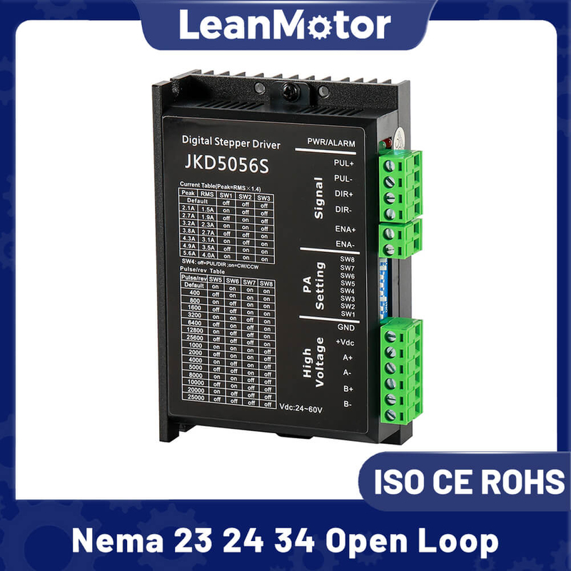 LMD5056S is a new digital stepper motor driver by LeanMotor. It adopts the latest 32-bit DSP digital processing technology. The drive control algorithm adopts advanced variable current technology and advanced frequency conversion technology. The driver has small heating, small motor vibration and stable operation. Users can set any subdivision within 200 ~ 51200 and any current value in the rated current to meet the application needs in most occasions. Thanks to the built-in micro-subdivision technology, the subdivision effect can be achieved even under the condition of low subdivision. The operation is smooth and the noise is ultra-small under low, medium and high speed. The driver integrates the parameter auto-adjust function, which can automatically generate optimal operating parameters for different motors to maximize the performance of the motor.